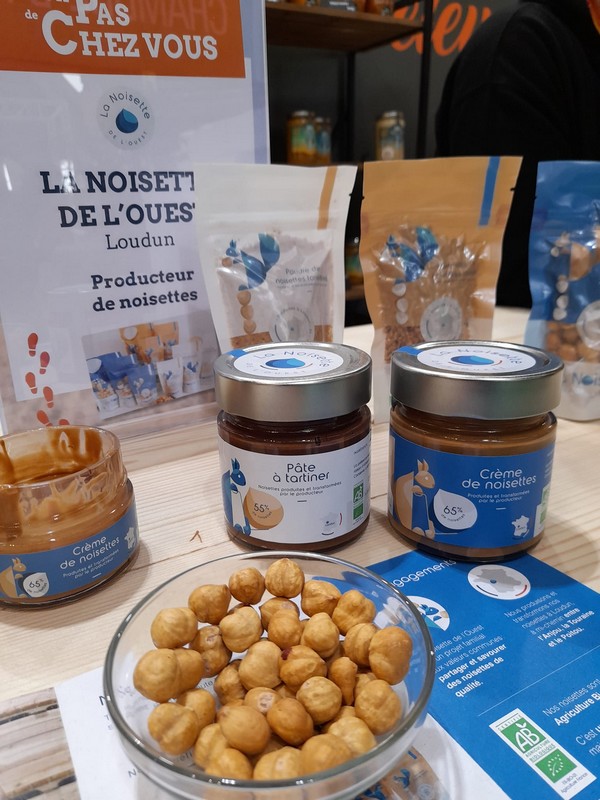 En vente au K’di Fermier : sachet de noisettes entières torréfiées BIO, granulat et poudre de noisettes torréfiées BIO , pâte à tartiner et crème de noisettes BIO.