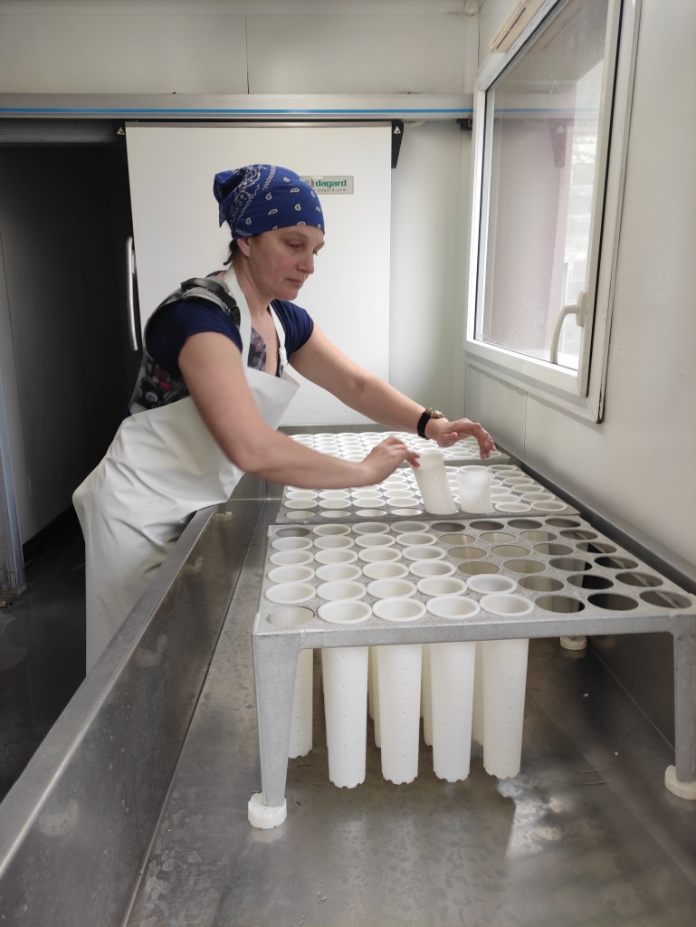 Avec des gestes précis, Iryna moule pendant 2h le lait caillé dans les fameux moules coniques à trous afin de les égoutter.