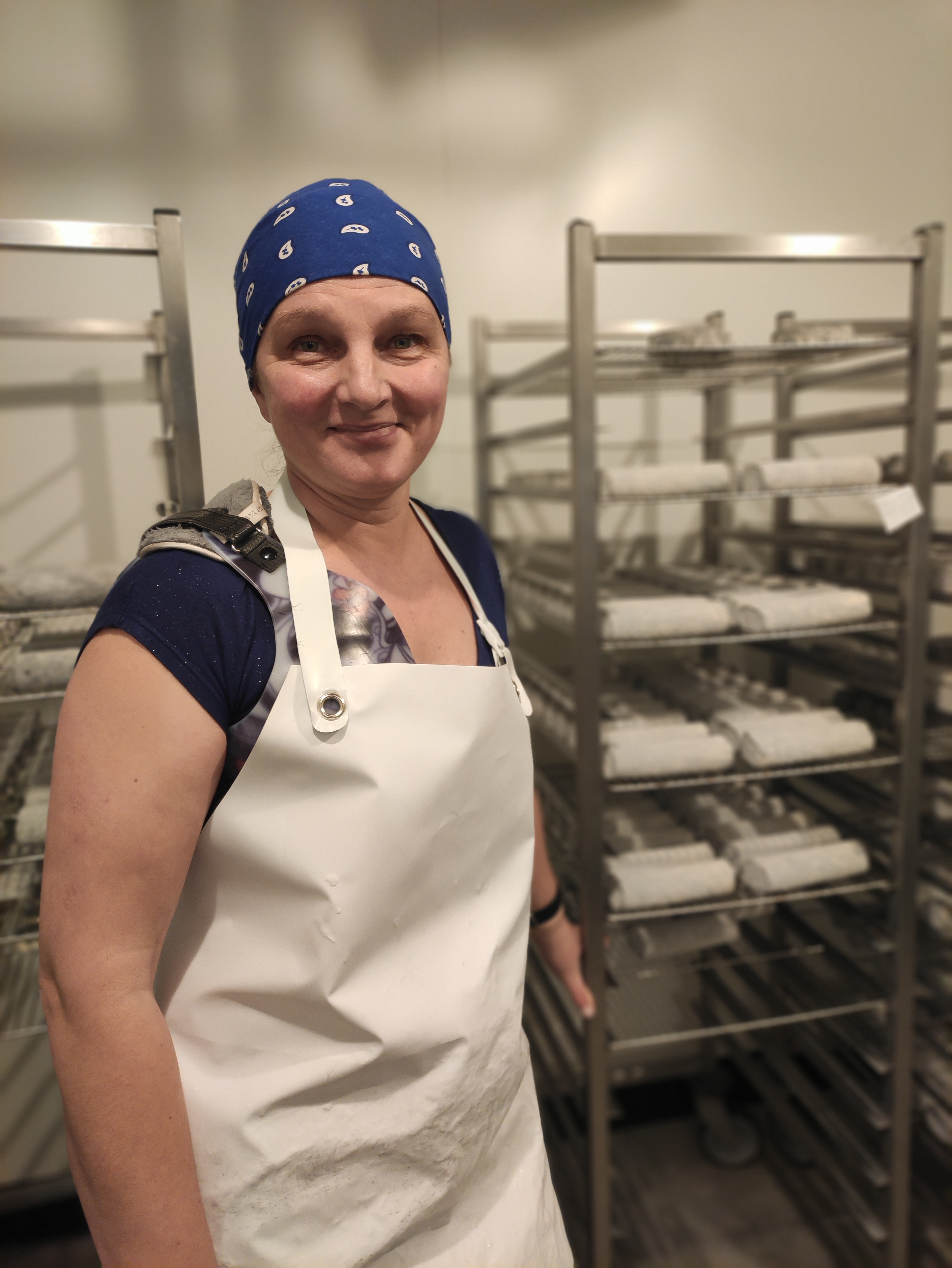 Iryna va ensuite casser la croûte, non pas pour faire une pause gourmande, mais la croûte du caillé qui permet une meilleure tenue de la bûche fromagère lors du démoulage le lendemain. En effet, les moules garnis vont rester à s’égoutter toute une nuit.