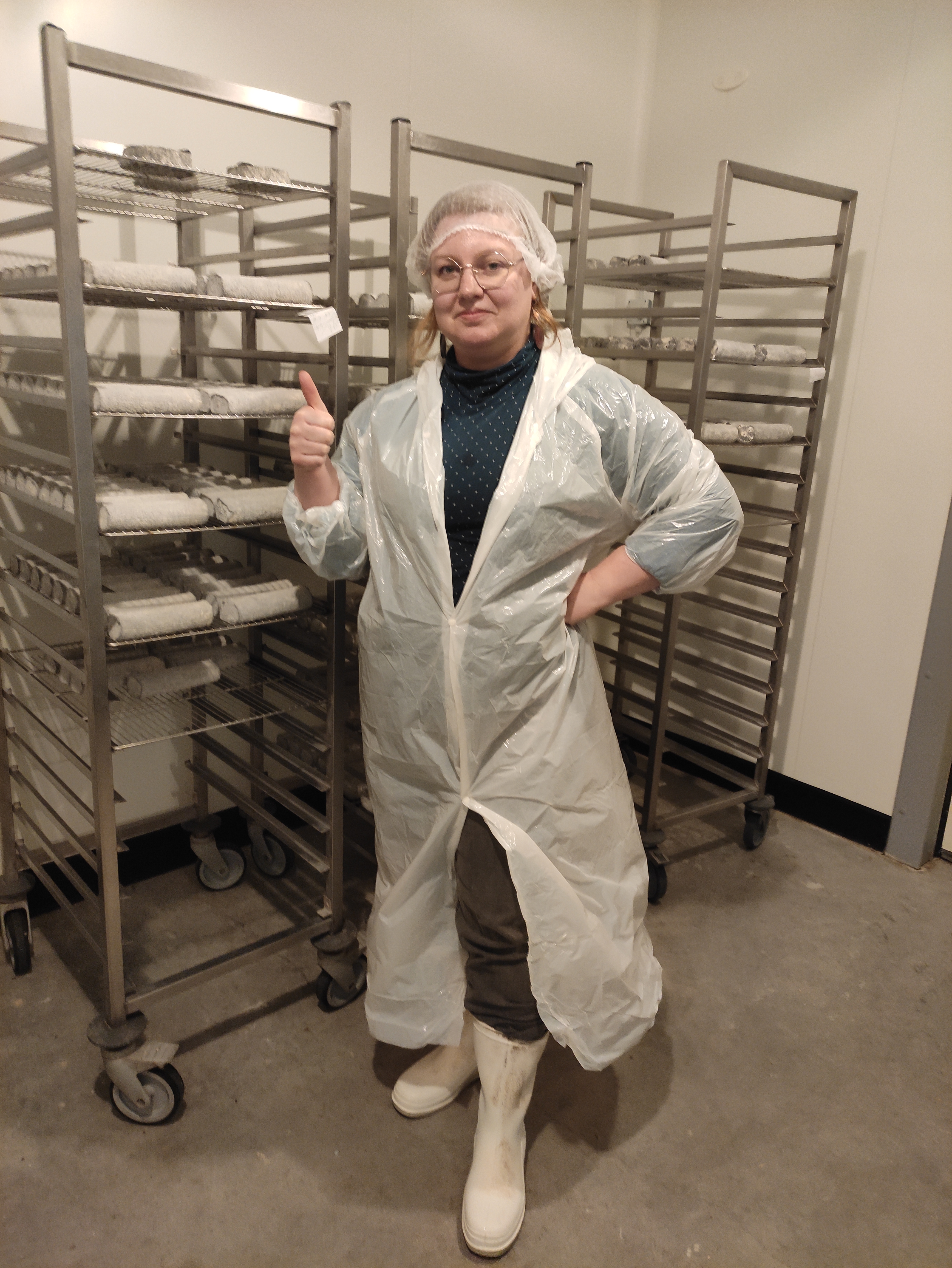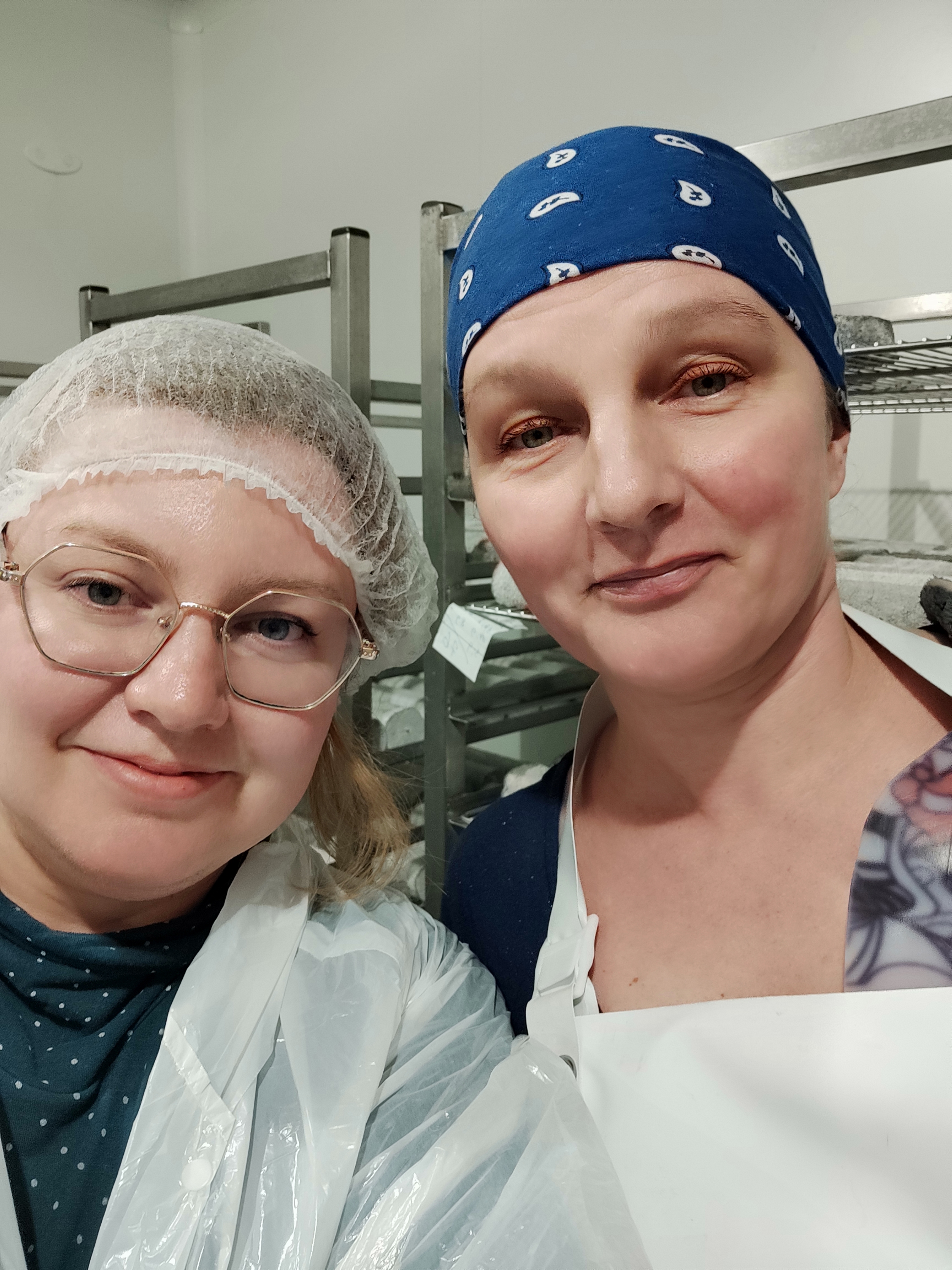 Changement de décor avec la chèvrerie, nous entrons charlotte sur la tête et surchaussures dans la fromagerie d’Iryna d’un blanc immaculé où il fait toute l’année entre 20 et 23 degrés.